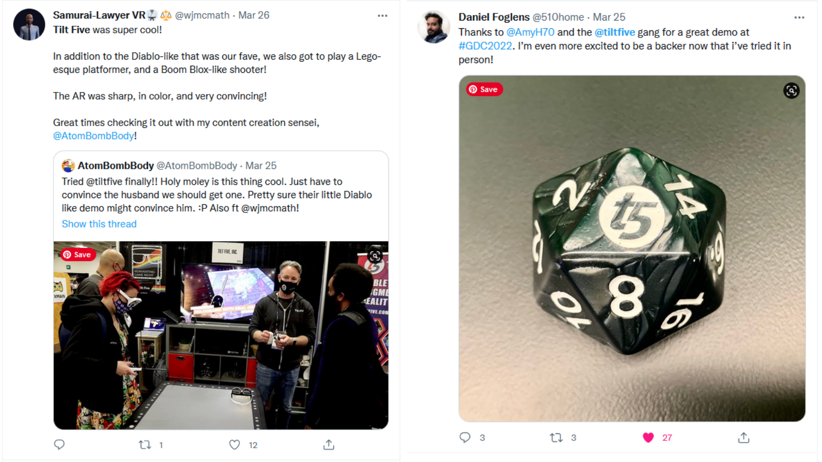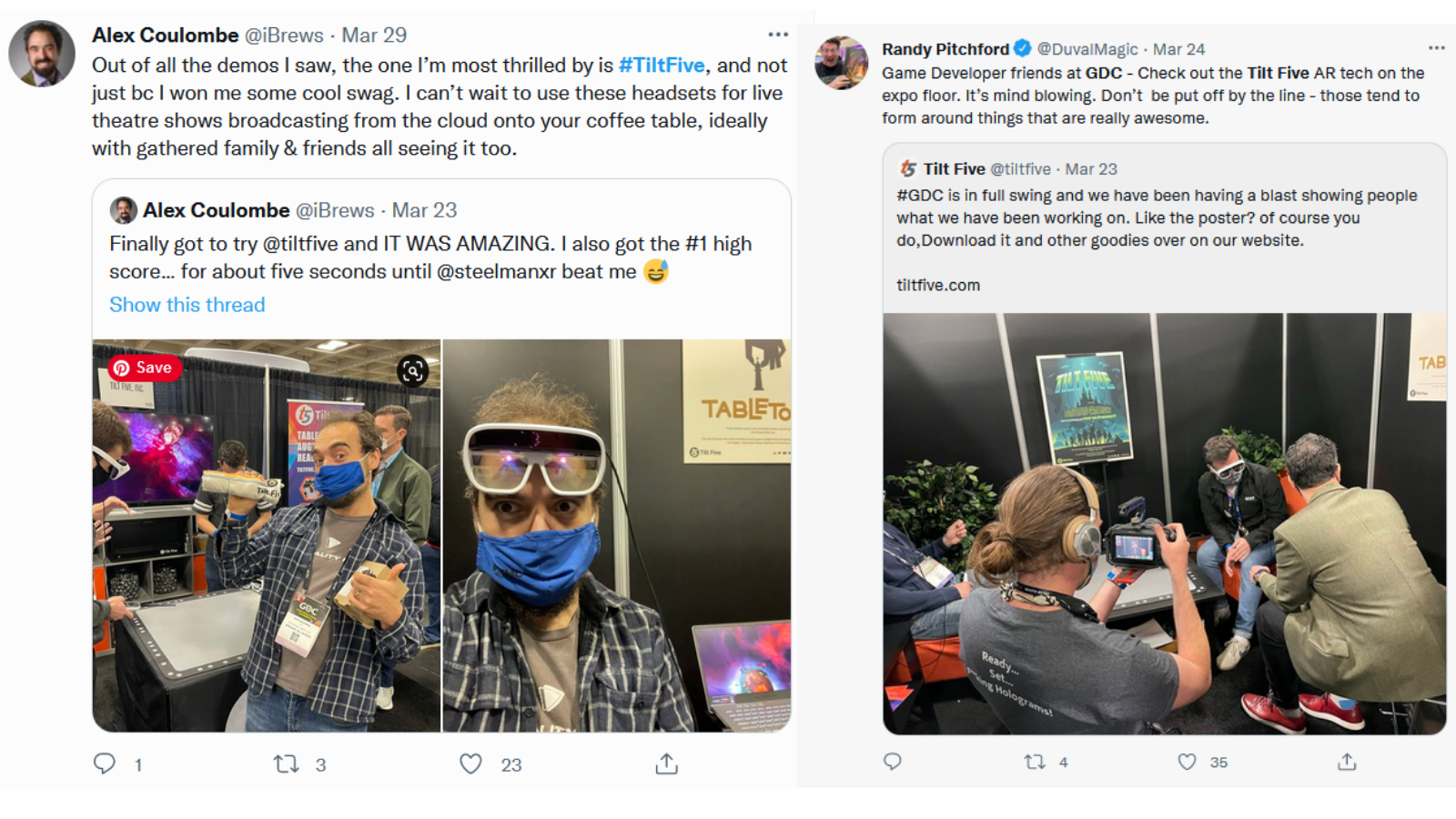 "The experience of using Tilt Five reminds me a lot of using the Nintendo Wii at parties. It’s like a large screen that you can only see with glasses, except that your view point on the screen changes with the 3D graphics." - Micah Blumberg, SVGN