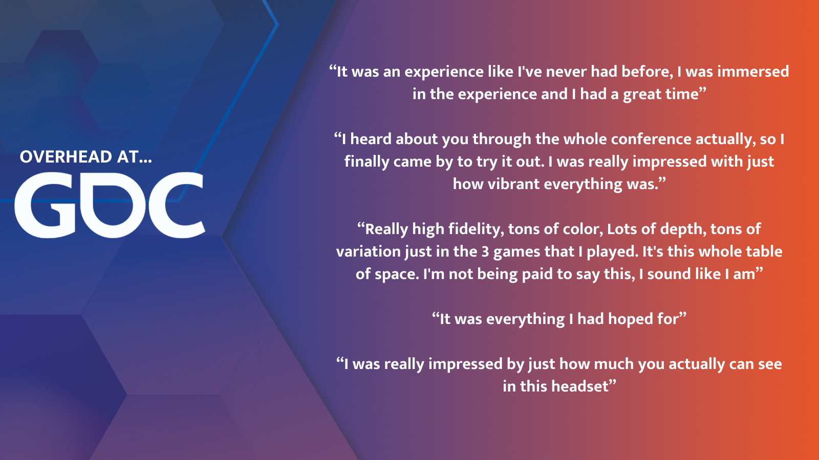“I really really really enjoyed this, the wow factor on this thing is through the roof… it looks incredible, it plays incredible…”– Skeeva, Upload VR podcast “Between Realities @ GDC”